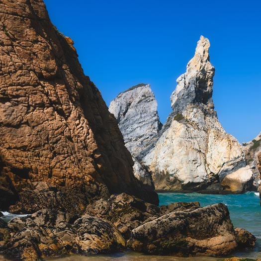 The rocky coastline of Portugal’s Iberian Peninsula skirts the Atlantic Ocean and provides the